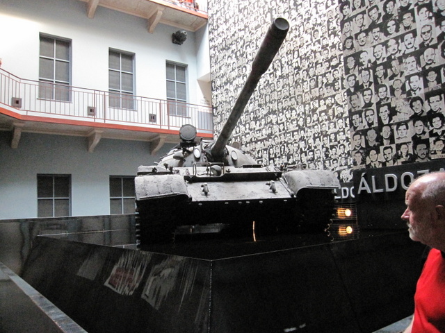In the four story courtyard, a Soviet tank stands in a pool of water that reflects the thousands of photos of Hungarian victims of the AVO that cover the walls.