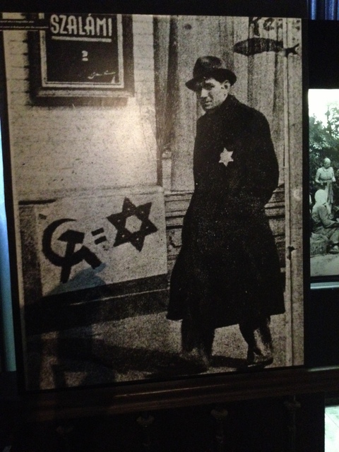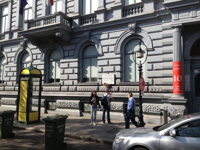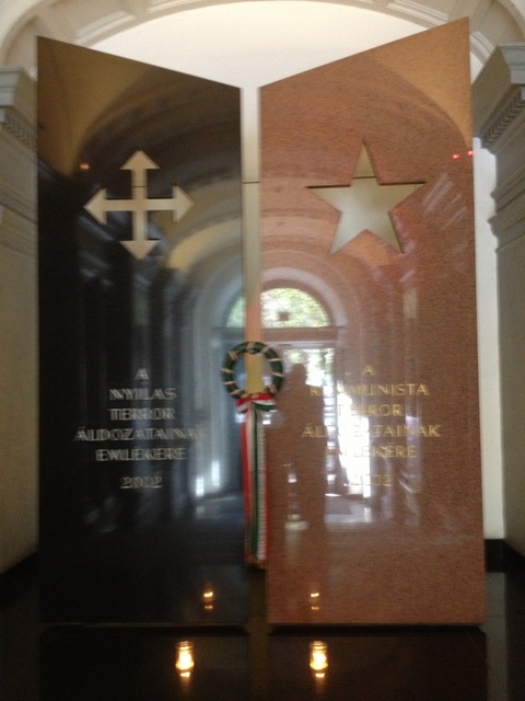 Stone tablets dedicating the museum in 2002. Note the symbol of the Arrow Cross Party, the local Nazis, and the communist star. The emphasis of the museum was mostly the communist era and only a minor portion was devoted to the Arrow Cross period. The Hungarian people seem more comfortable with the image of being victims of Soviet led oppression rather than as the allies of Hitler, complicit in delivering over 400,000 Hungarian Jews to the gas chambers at Auschwitz.