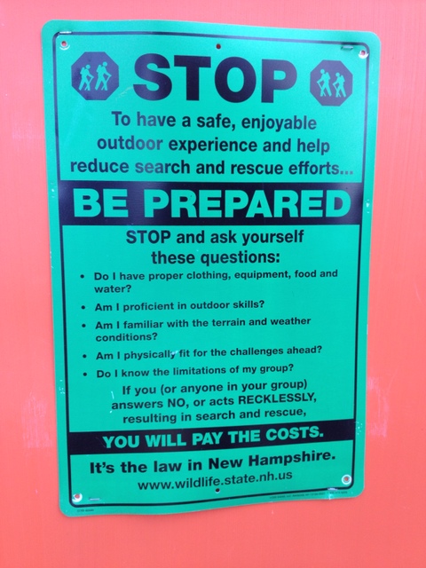 Generally posted throughout the mountains, these posters are meant to remind hikers that rescues by the State of NH resulting from hiker stupidity will be charged to the stupid hiker. Only fair. We read all the time about nitwits in shorts and sneakers calling for help on their cellphones from dark, cold mountain tops. Know your limitations. People still die up here, every year.