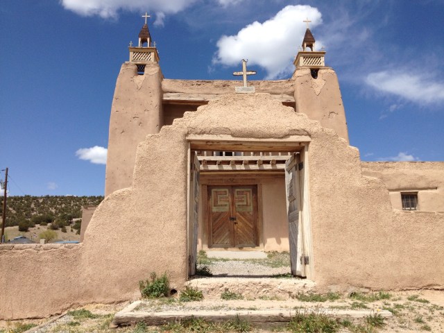 It was a fun drive through the mountains for about three hours. The whole Santa Fe-Taos region is high desert with mostly scrubby trees and bushes. Lots of trailers with abandoned cars and pickups, tumbledown barns and sheds and also some ancient adobe churches.