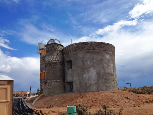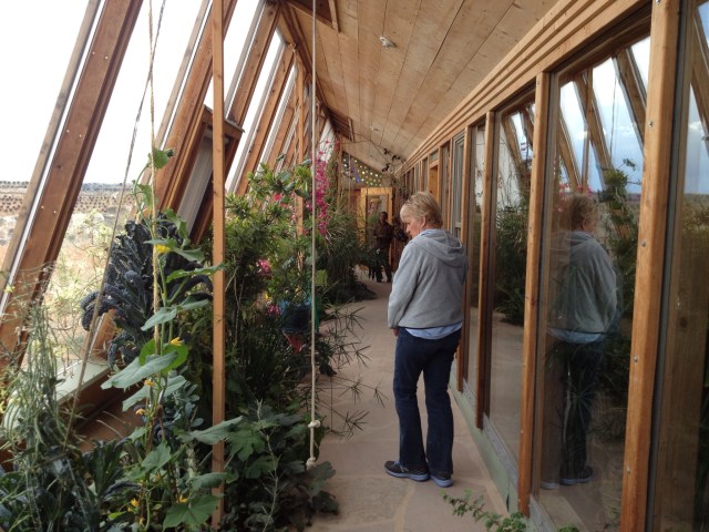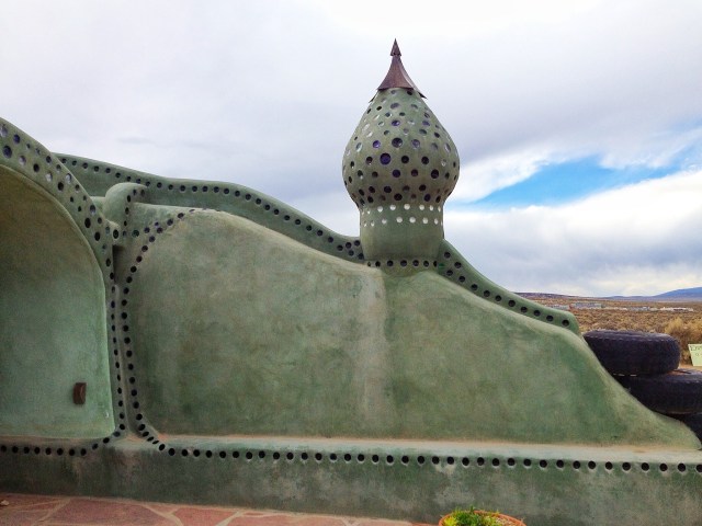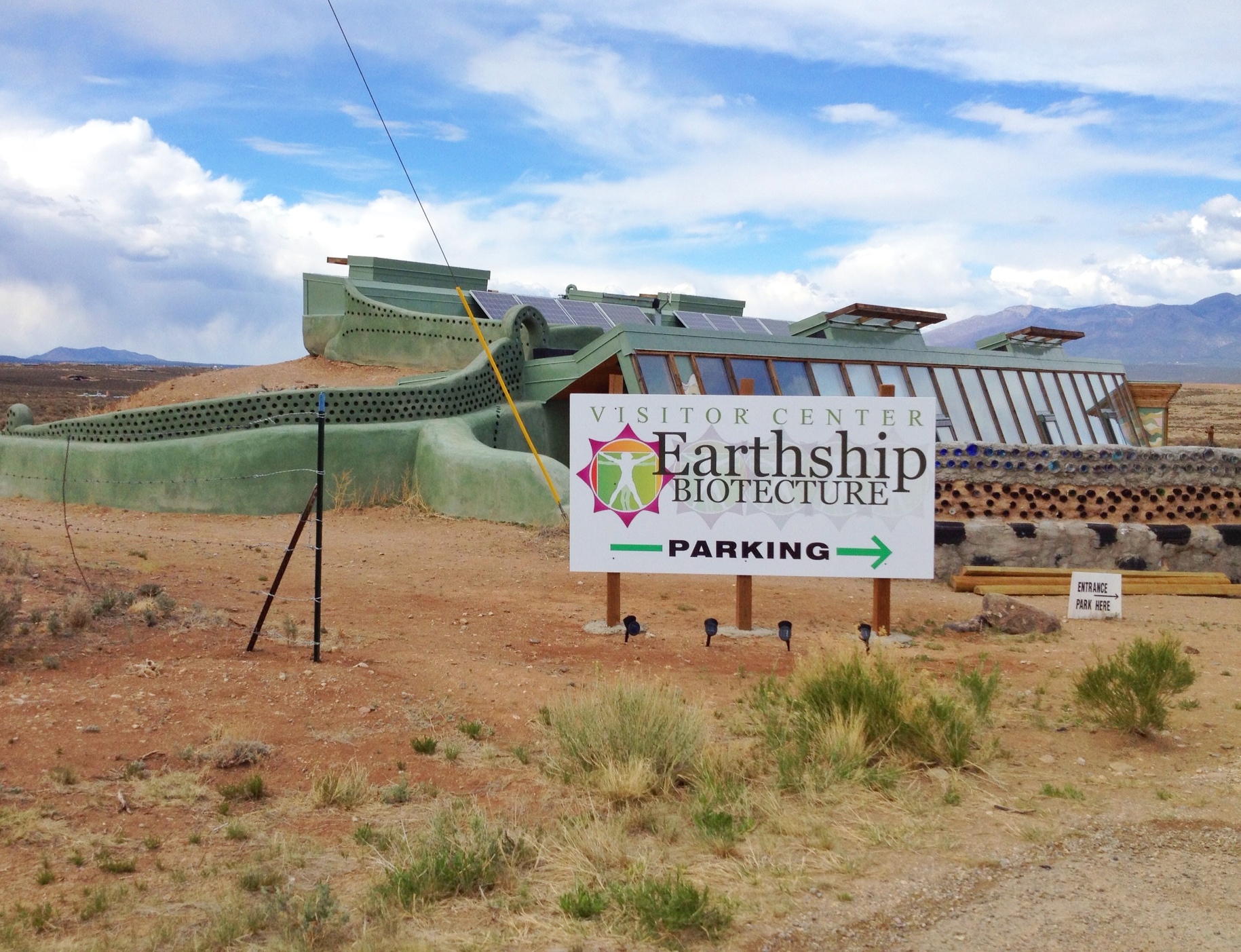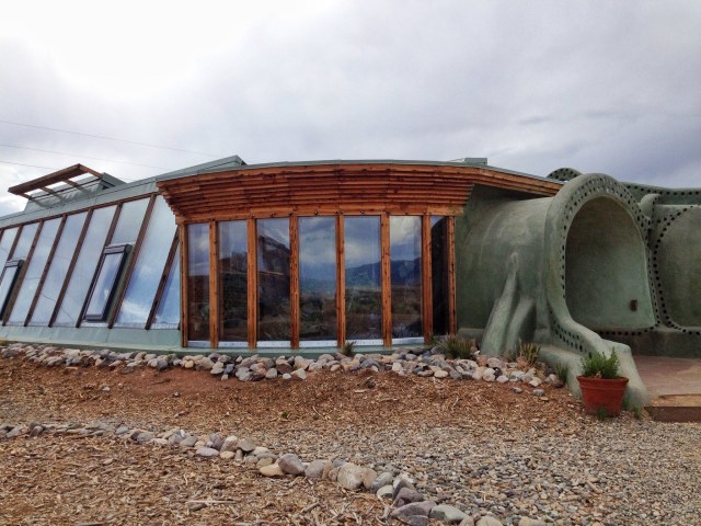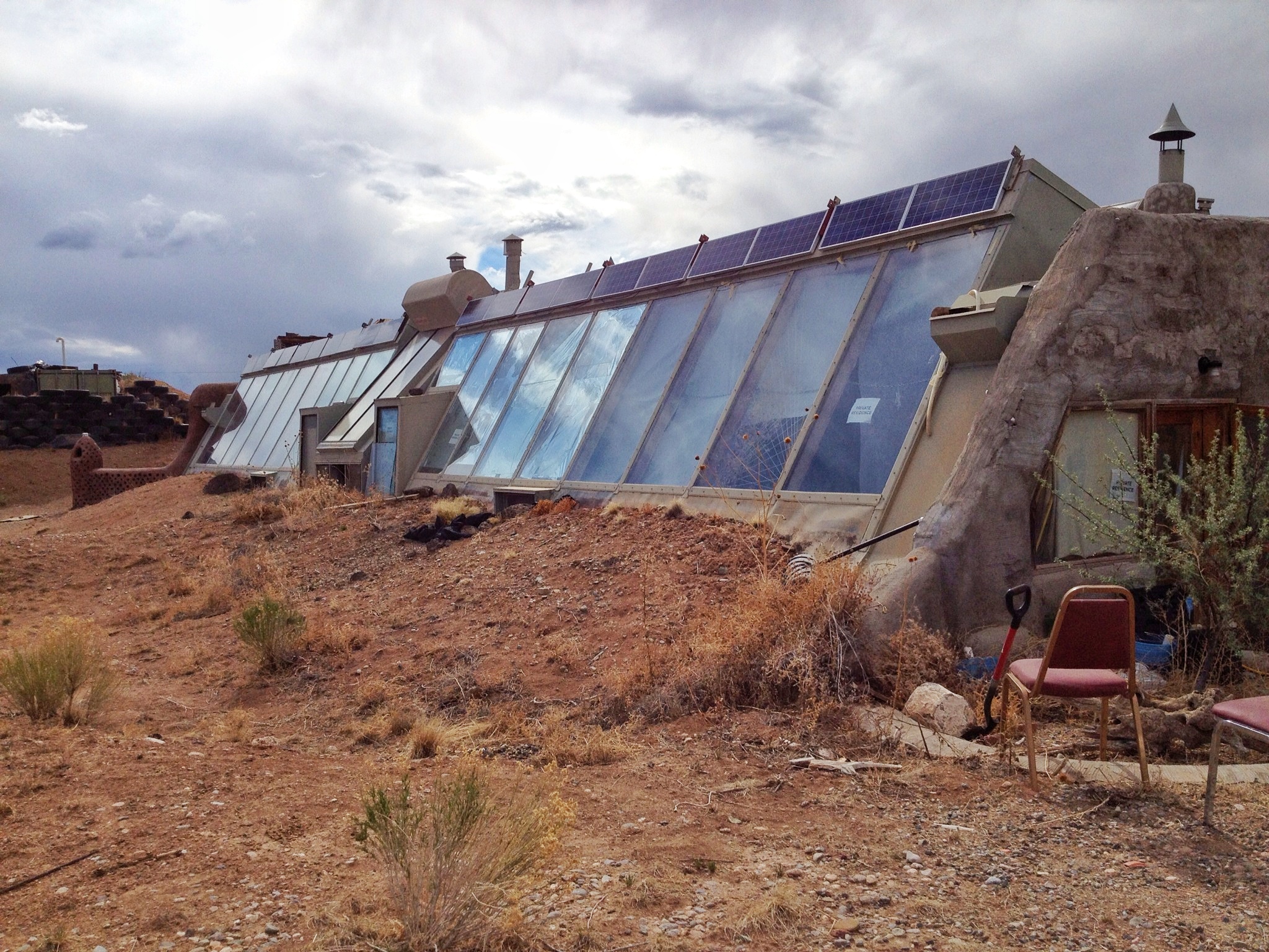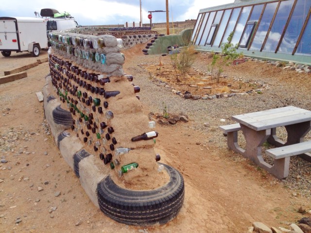 There are a few standard design Earthships as well as almost unlimited custom configurations. Essentially, you can build anything incorporating the philosophy and systems developed to limit the impact on the environment. The one above is the standard design and, being complete and inhabited, shows the wear and tear of continuous use. Not as impressive as the “model home” used as headquarters.