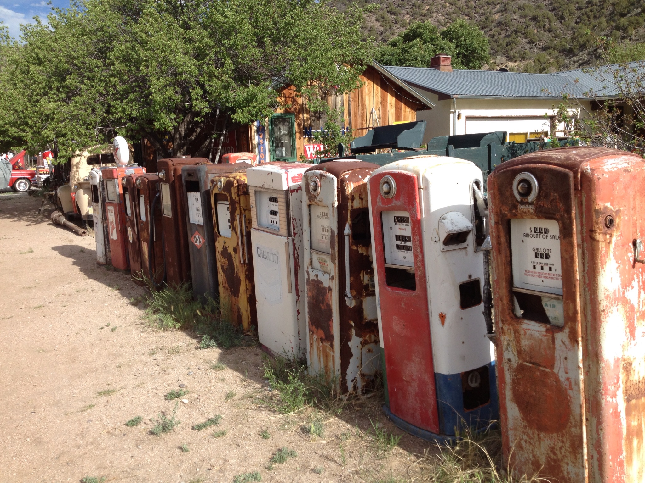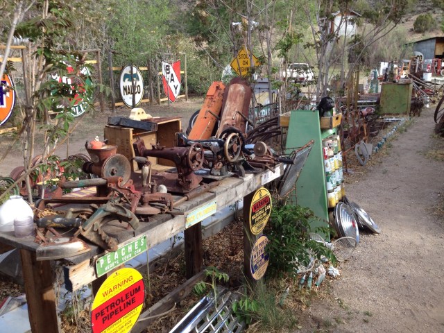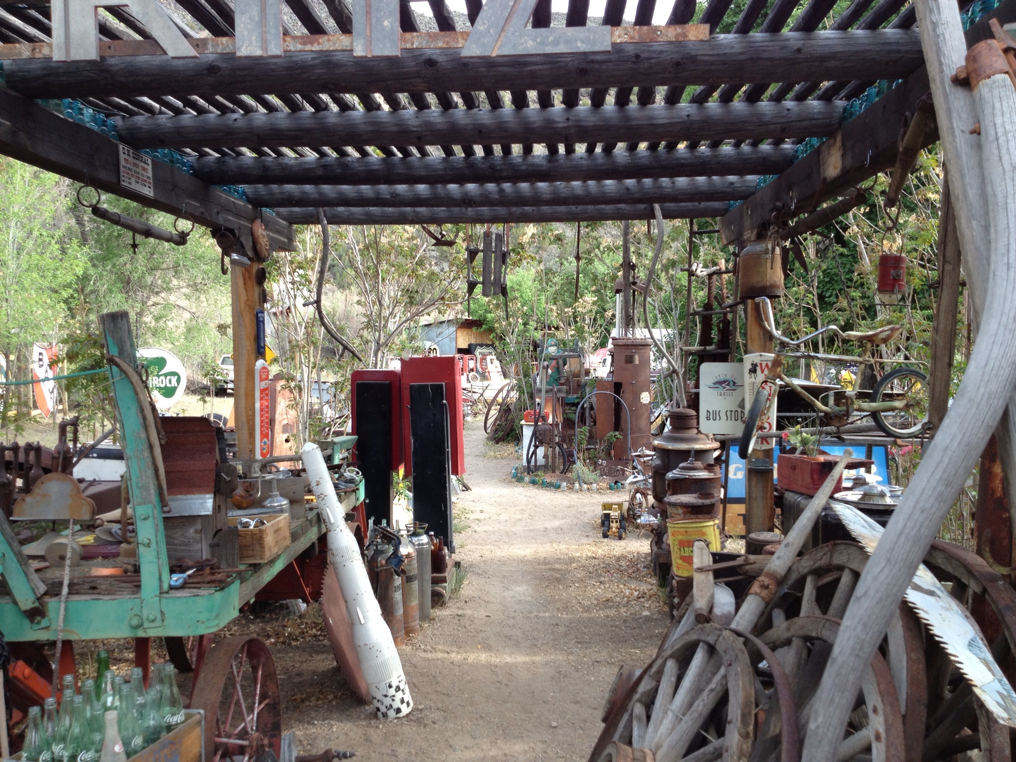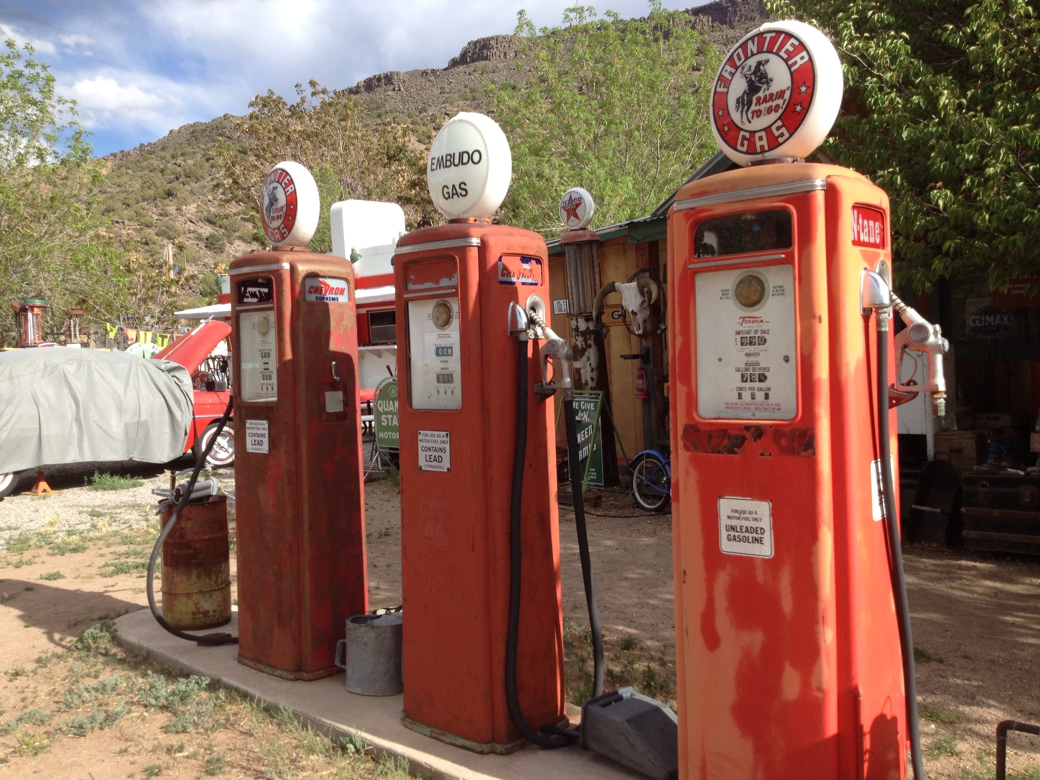 On the road south from Taos (Highway 68 in Embudo, to be exact) we had several times driven by an old tractor in front of a dilapidated building sporting the hand-painted words “Gas Station Museum”. As we sped by, I saw the yard filled with all sorts of…well, junk.