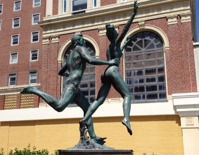 A statue meant to commemorate carefree days of youth at the beach. On close inspection, yes, they are wearing suits; it was never THAT carefree, evidently.