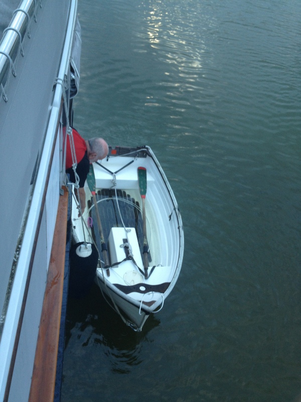 Anchoring meant that we had to use the crane to move the dinghy from the top of the cabin to the water, two passengers would then clamber aboard and then Larry would row the 15 minutes to the town dock where we would climb up onto the embankment and walk two blocks to downtown.