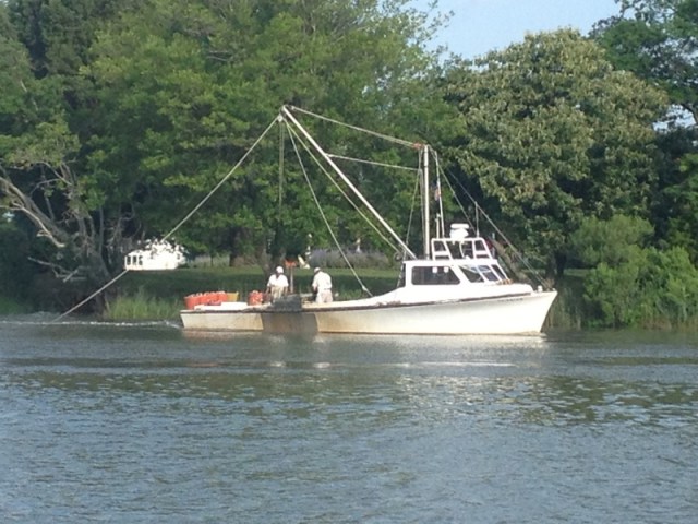 Local "watermen" operate an oyster dredge next to where we are anchored in the creek behind St. Michaels. Because of the excessive heat, they dredge early (and noisily) all up and down the creek and as close to our boat as they can. Captain Larry says having "Boston, MA" painted on our stern may be a disadvantage here.