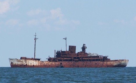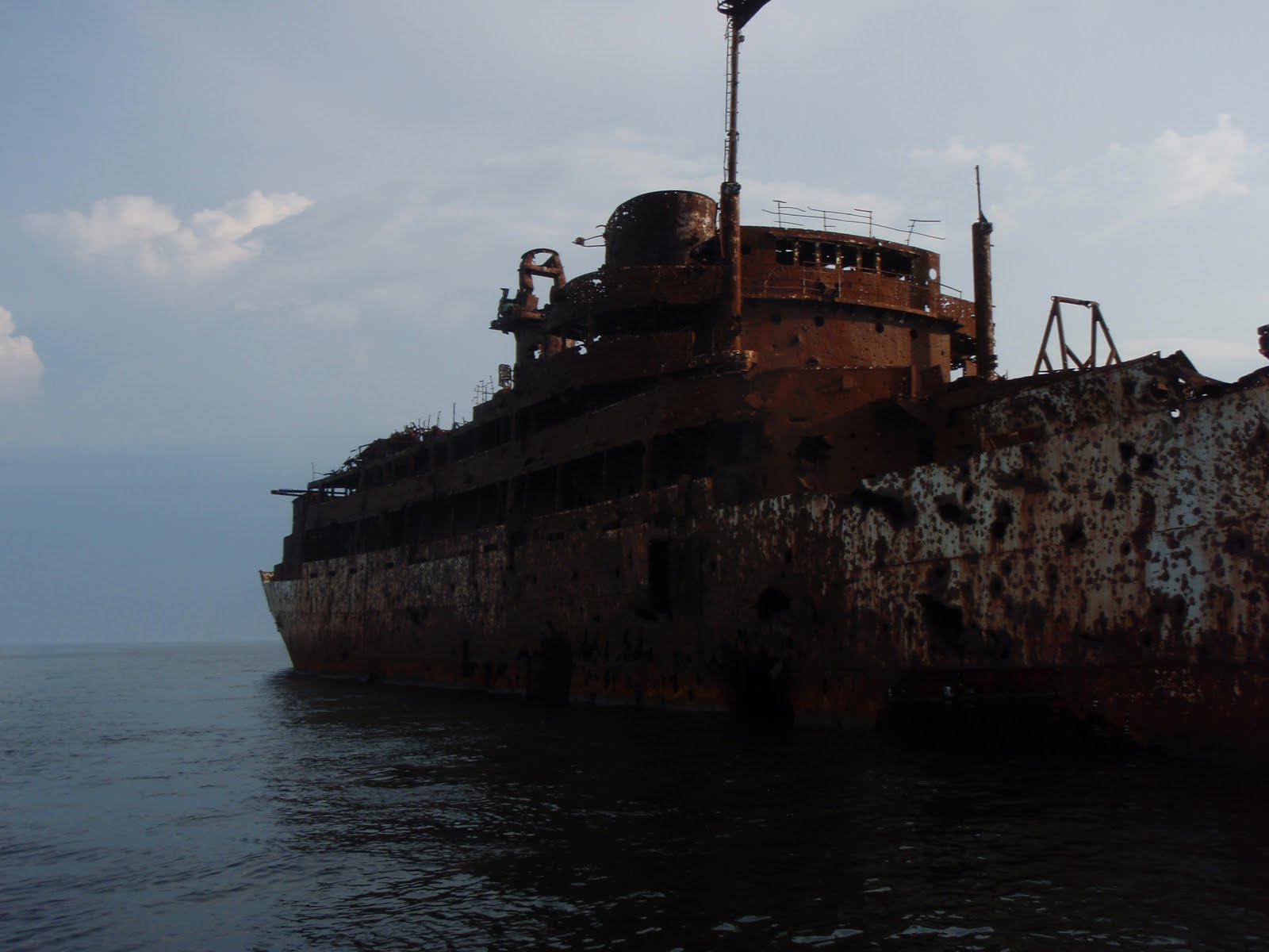 Until you get a bit closer and see that she is just shot to shit. There seems to be no visible undamaged area left. Plans are to leave the hulk until it rusts away of it’s own accord. Unfortunately,she’s in a restricted area (imagine the ordinance laying around, both aboard and in the adjacent waters) and we couldn’t get close enough to take our own pictures with the iPhones.