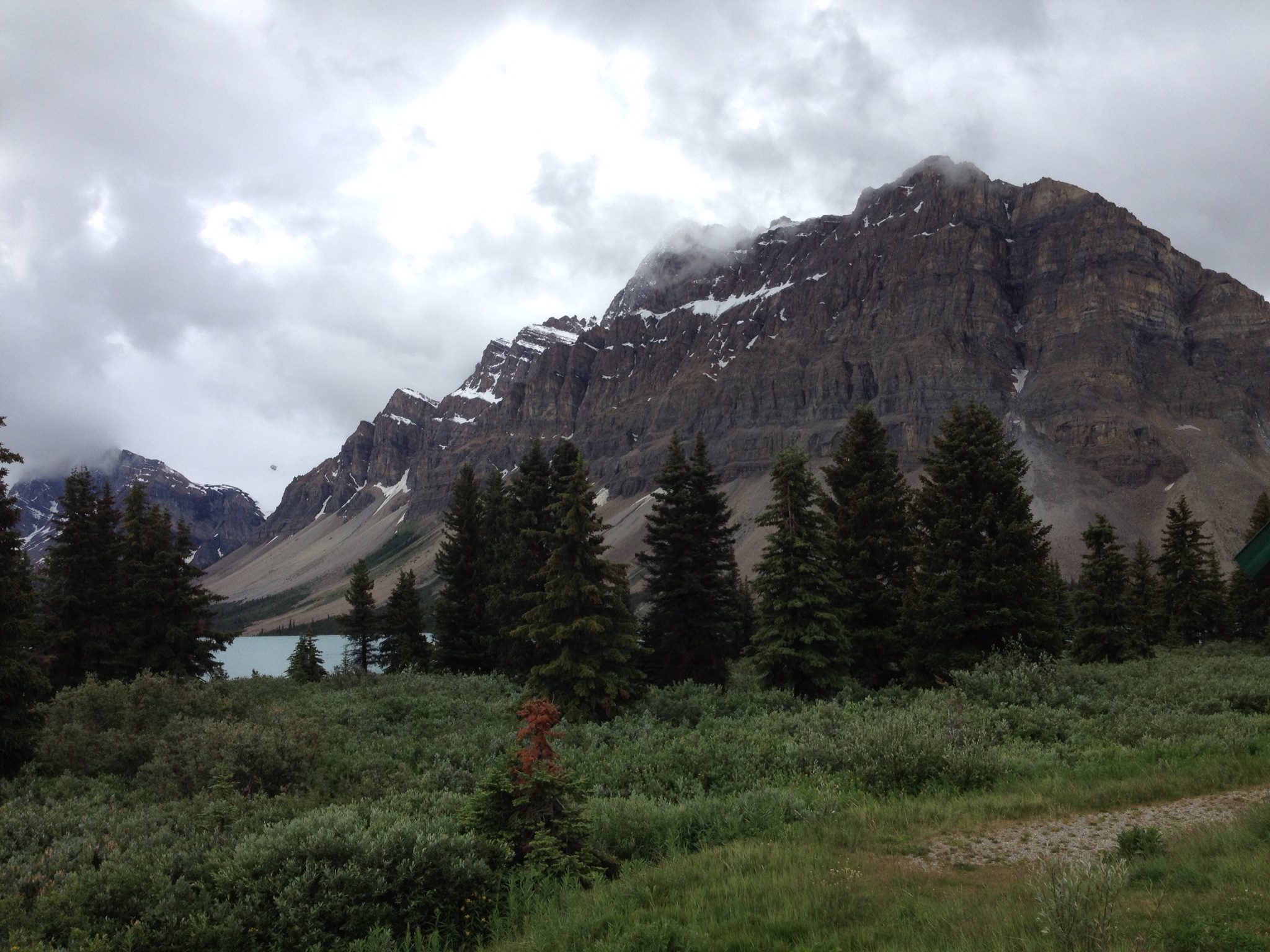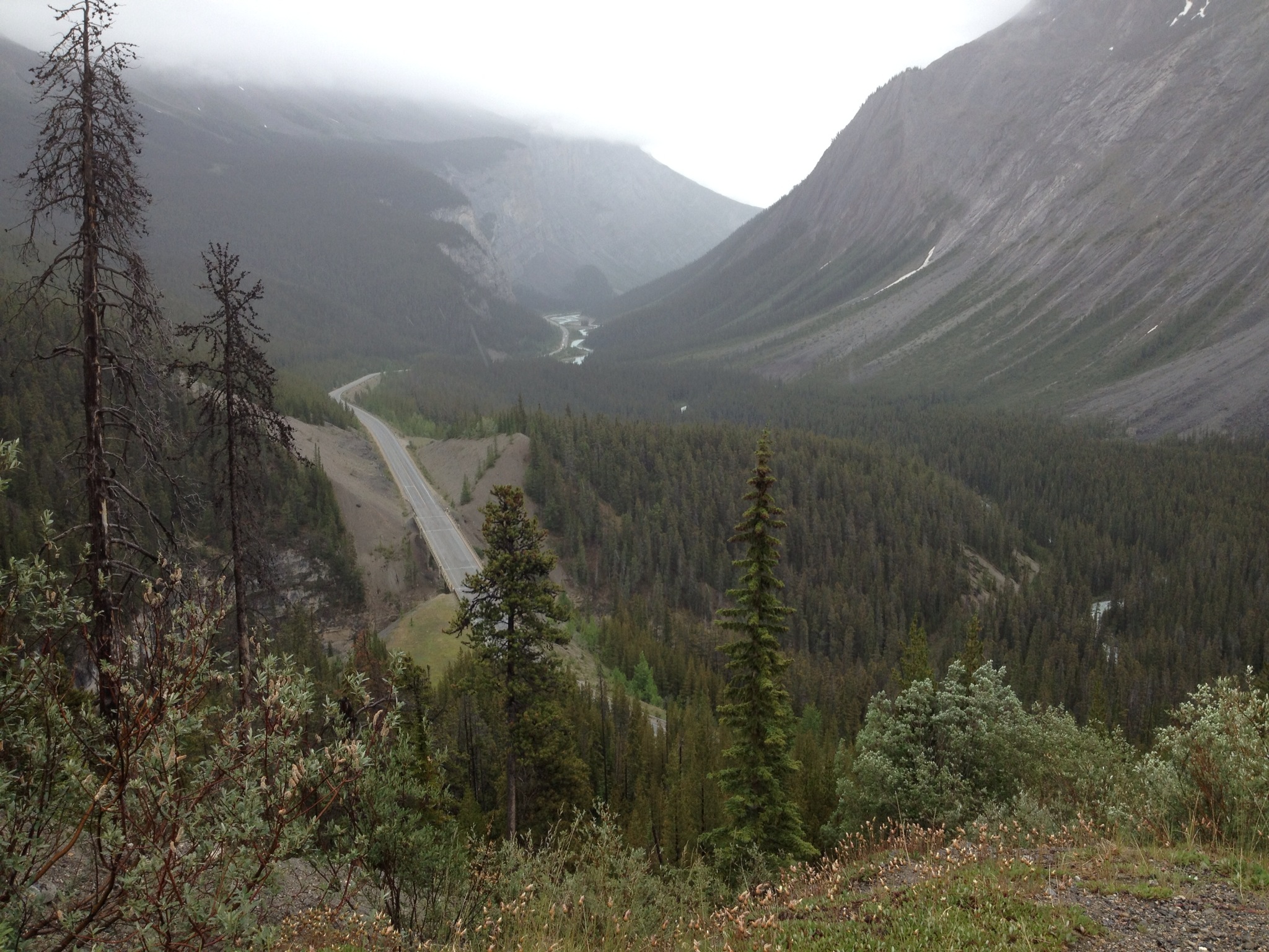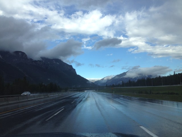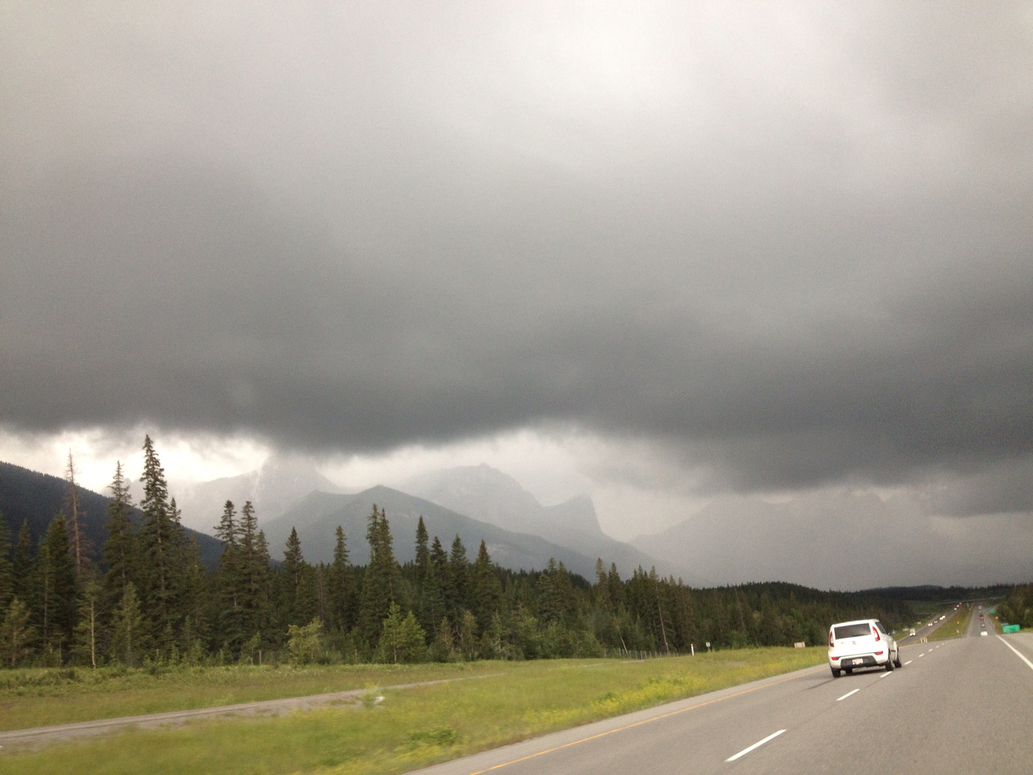 We left about 7:30 in drizzle (guess who’s driving) and it was thunder and lightning by the time we hit Canmore for gas and provisions.