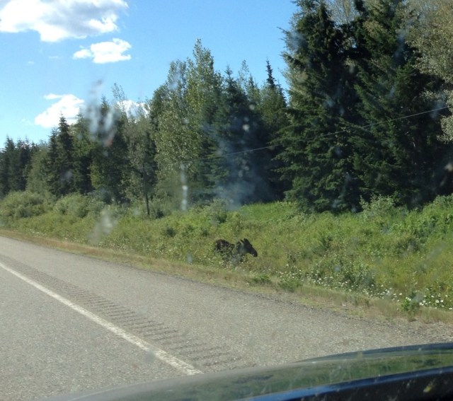 We saw our second moose, who walked across the road about 100 yards ahead of us as I scrambled to slow down and point my camera. I did get this partial as she went across the ditch at the roadside, but she sure did look majestic as she sauntered across the road. You’ll have to take my word for it, I guess.