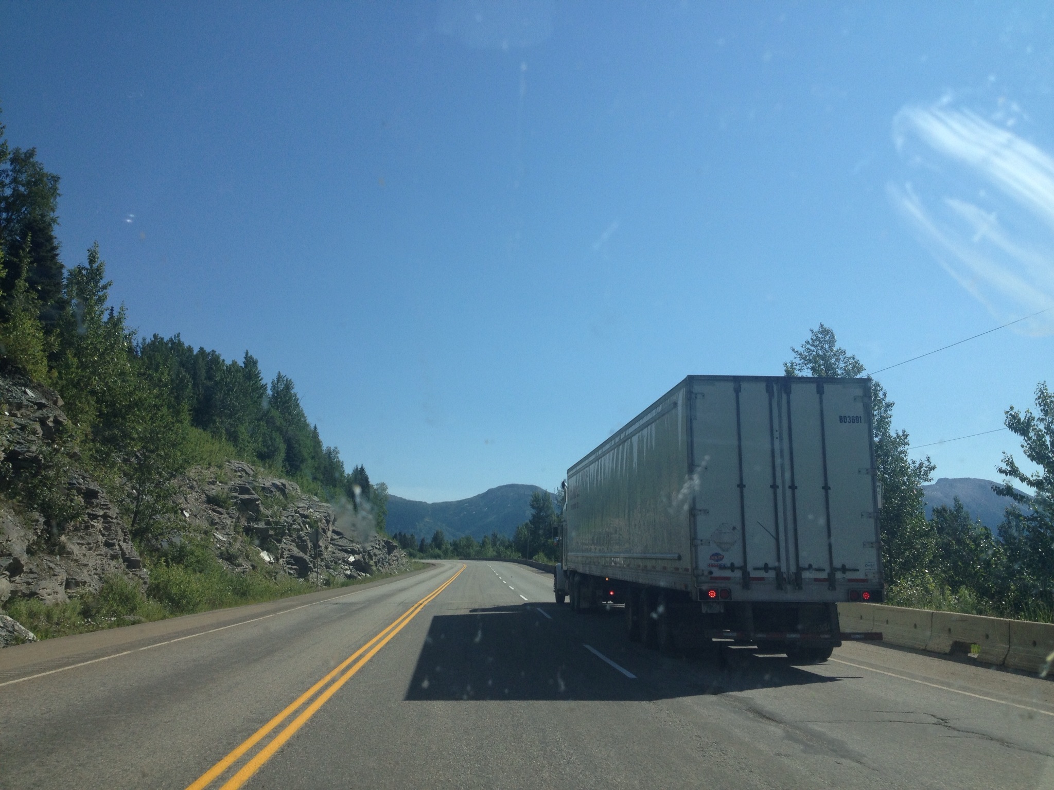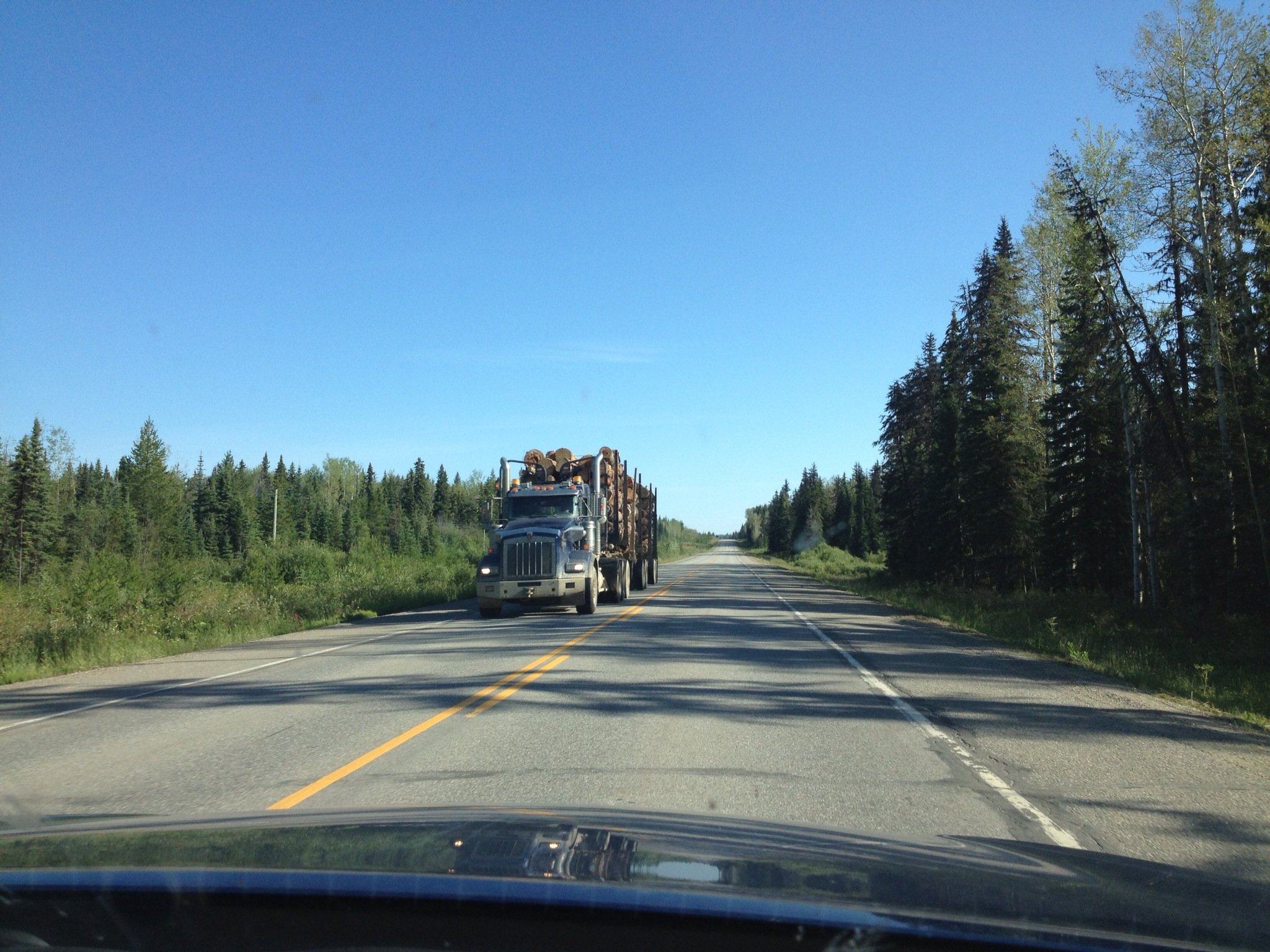 Lots of logging trucks on the road today. But still, not much traffic the last few days. Often we are the only ones for miles on ridiculously long straight roads. We last travelled in congestion when we were in Calgary on Sunday afternoon. Canada is pretty sparsely populated. (Ed: Duh!)