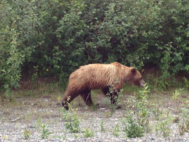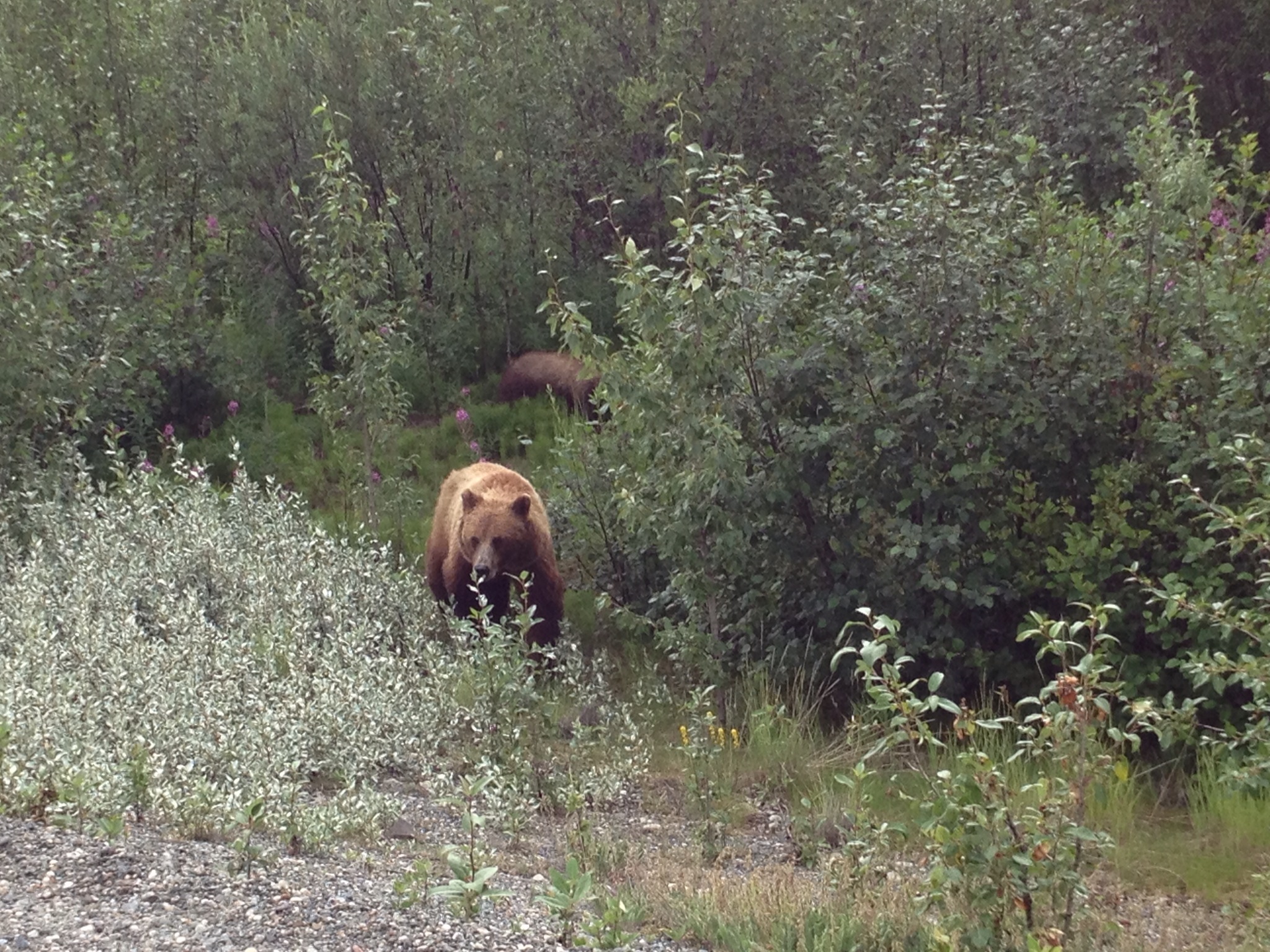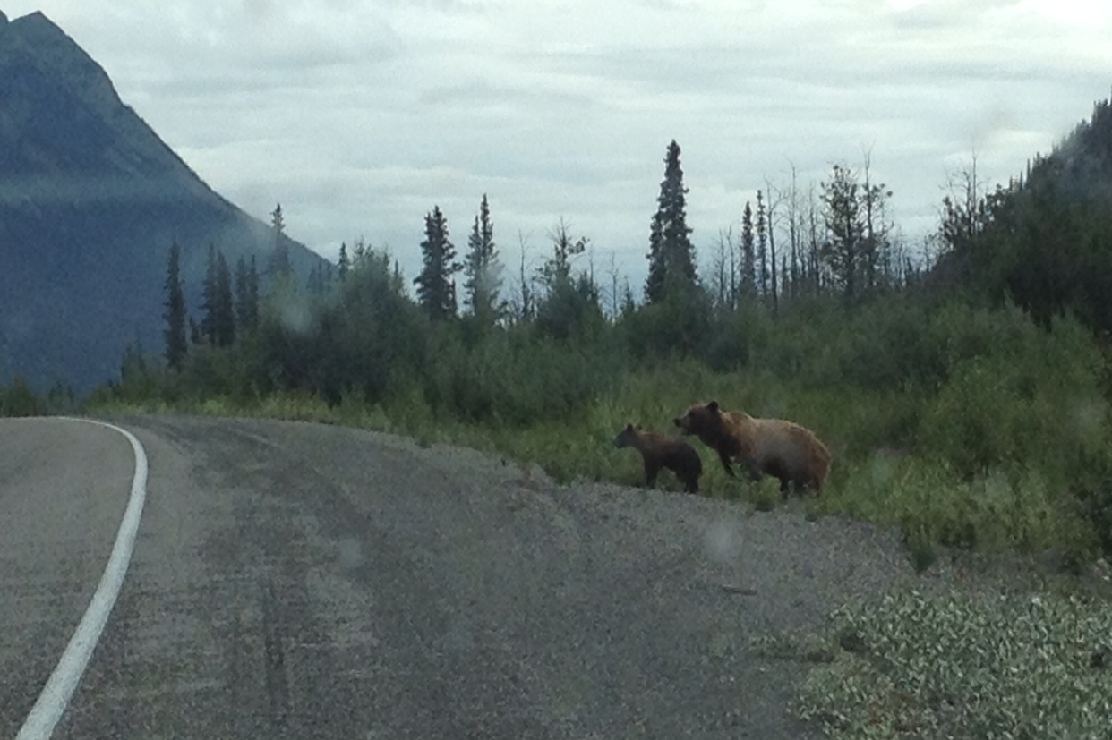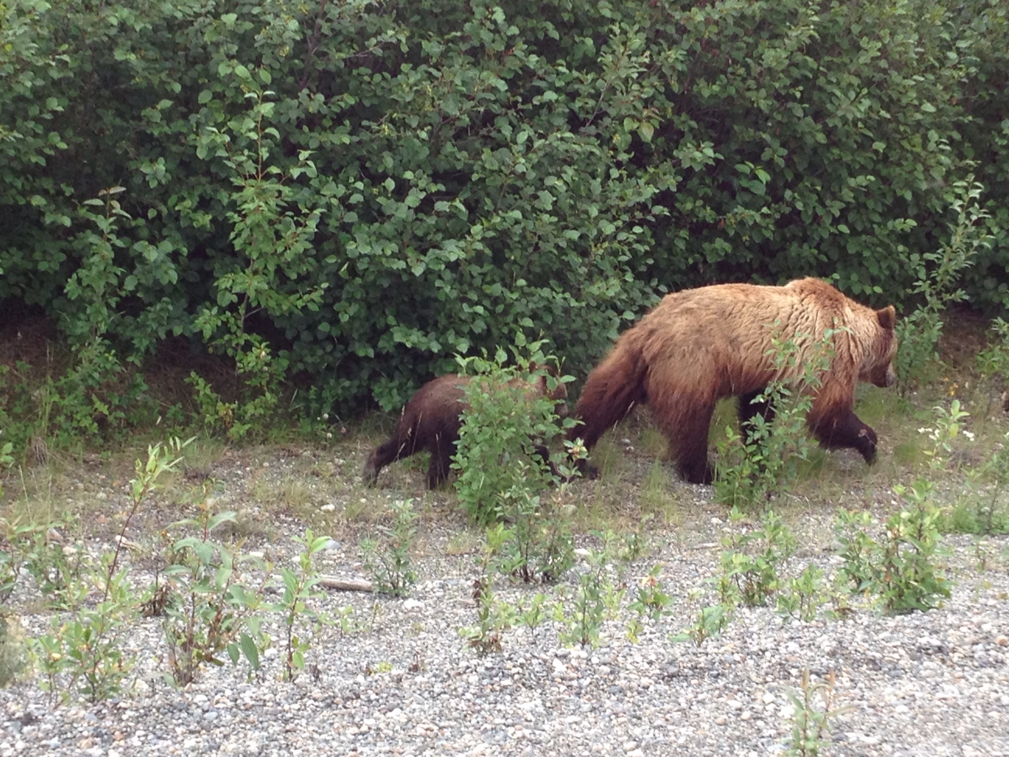 It was a mama grizzly and her cub. We stopped as close as we dared and took some pictures.