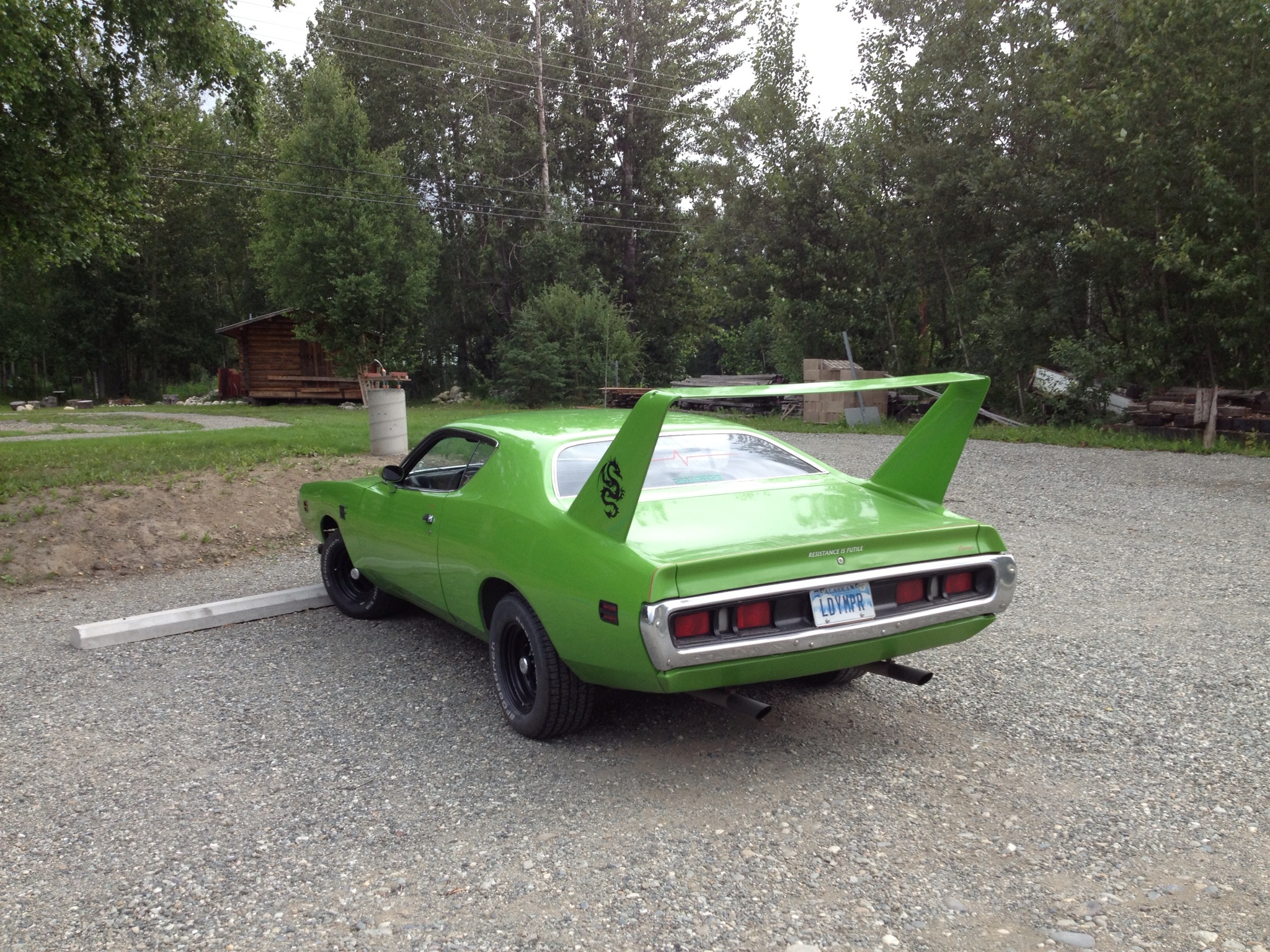 This limited edition lime green Dodge Charger with official NASCAR spoiler was parked in the lot next to us. I was going to ask what year it was, but the crazy woman animatedly talking to herself behind the wheel frightened me.