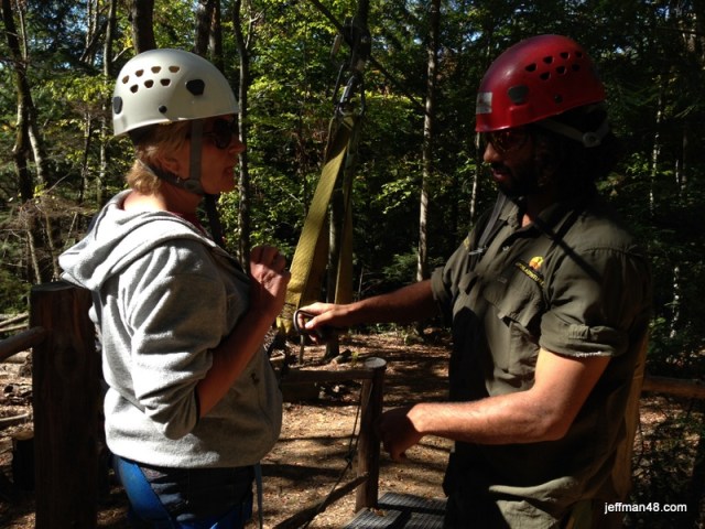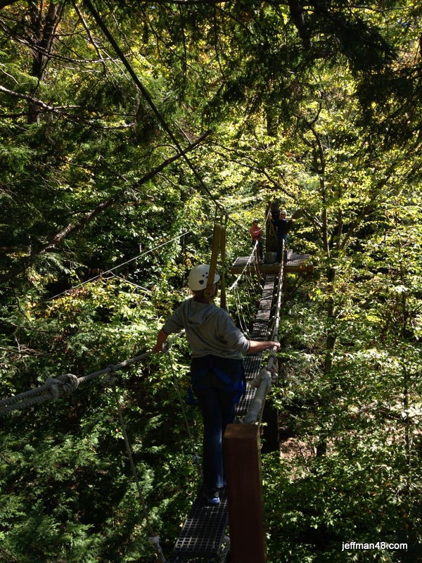 As you can see, anytime we walked across bridges or rode down cables from platform to platform, or even when just standing on a platform waiting, we were securely connected to safety lines at all times.