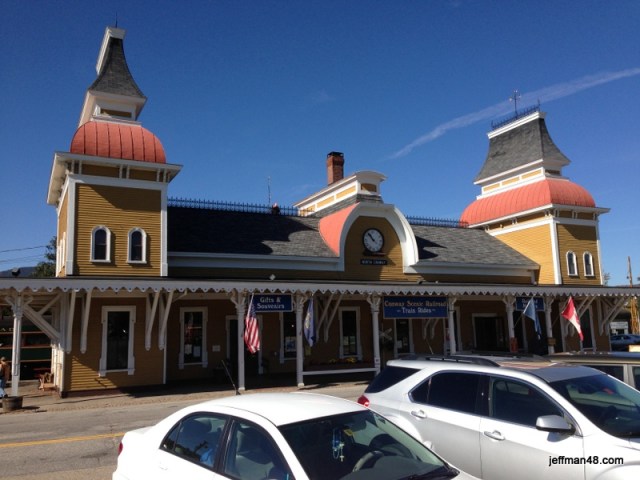 The food was…OK. It was provided by the dining service at Attitash, the big ski area in Bartlett. And the ride was nice as we rode through the forest at about 12 miles per hour with the whistle sounding long-long-short about every five minutes as we came to one of the many ungated crossings. Lots of waving to and from folks in the waiting cars as we pulled by. We got off in Bartlett to watch the locomotive do a "runaround" to the other end, but we could’t see much as the train cars were between us and the siding the big diesel used for the maneuver. Then we climbed back aboard for the uneventful return trip to North Conway.