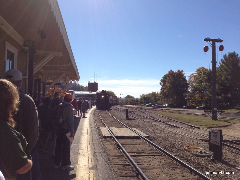 The food was…OK. It was provided by the dining service at Attitash, the big ski area in Bartlett. And the ride was nice as we rode through the forest at about 12 miles per hour with the whistle sounding long-long-short about every five minutes as we came to one of the many ungated crossings. Lots of waving to and from folks in the waiting cars as we pulled by. We got off in Bartlett to watch the locomotive do a "runaround" to the other end, but we could’t see much as the train cars were between us and the siding the big diesel used for the maneuver. Then we climbed back aboard for the uneventful return trip to North Conway.