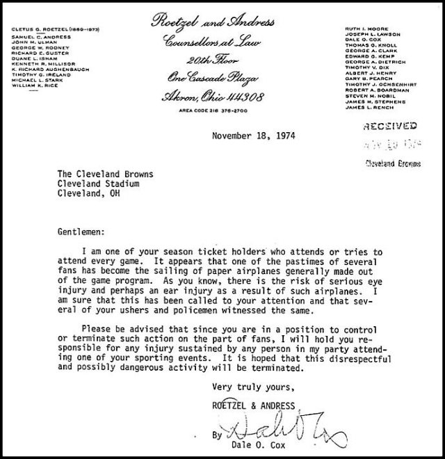 A Brown’s season ticket holder who (surprise!) just happens to be an attorney wrote to the team:
