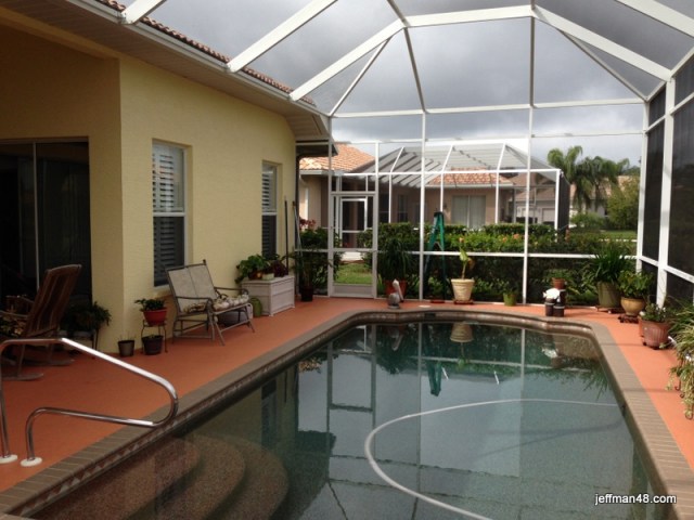 I was especially taken with the "pool cages" that everyone seemed to have erected around their patios and pools. It keeps out the local bugs and critters so that you can enjoy the out of doors anytime, day or night. Their "local critters" included an alligator (about 6 foot?) living in the retention pond in their back yard.
