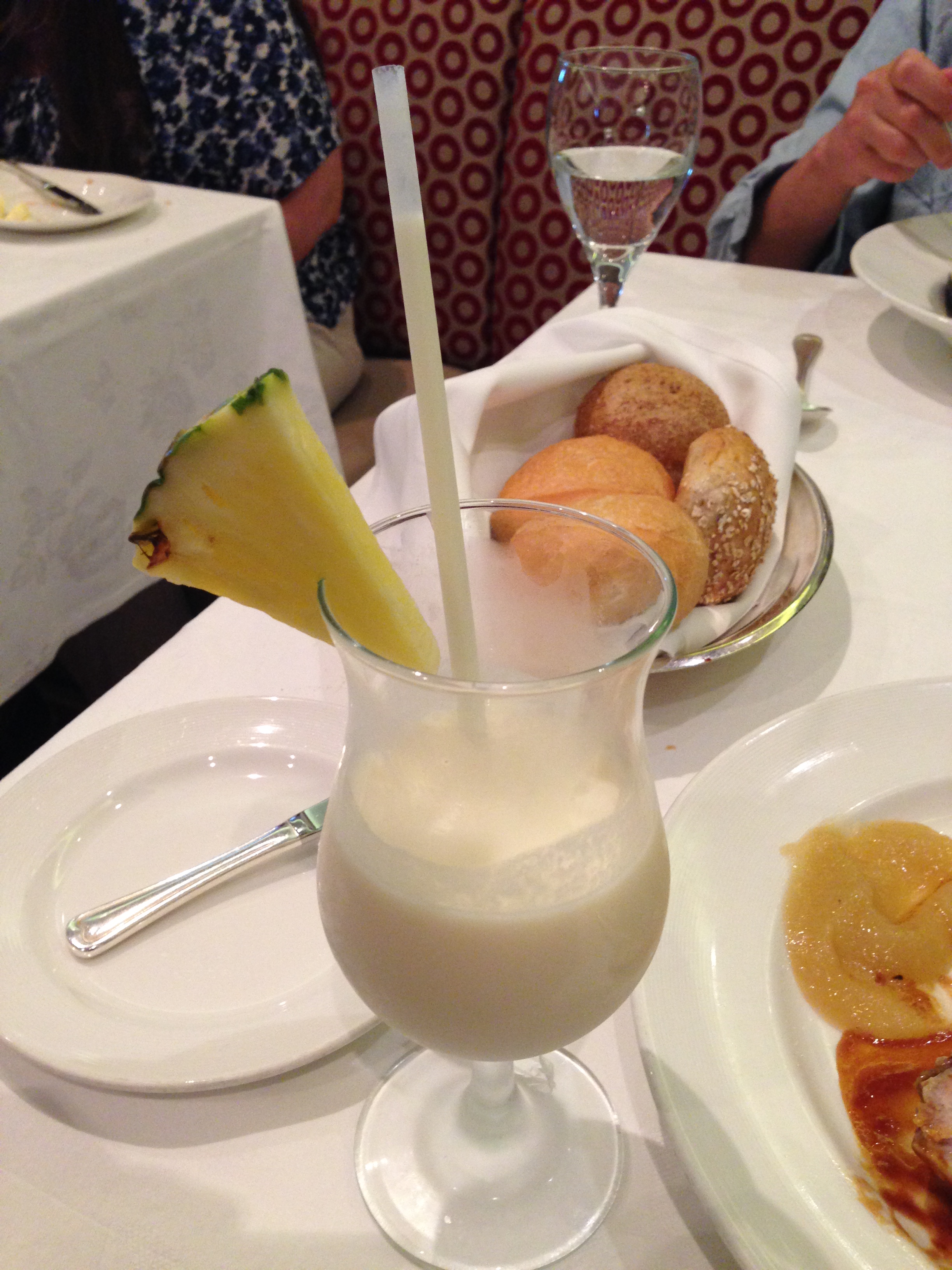 This “soup” seemed to be indistinguishable from a Pina Colada drink, so I had a couple. (Soup is included with the meal. Cocktails are an extra charge.) The ship left port during the meal and headed off to Naples, our first port of call.