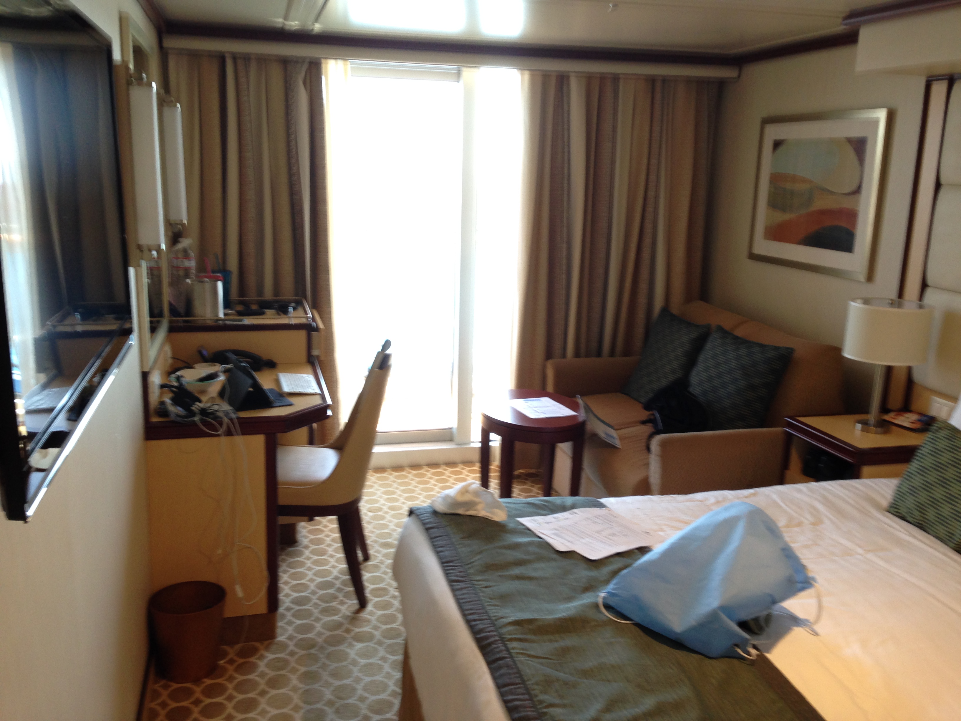 We got processed aboard pretty quickly, received our “ship cards” and were directed to our stateroom. Our suitcases were late, probably because they were first on the truck at the airport, but they arrived safely. We were called to our Muster Stations where we practiced donning our life vests and milling about aimlessly until we either abandoned ship or were released.