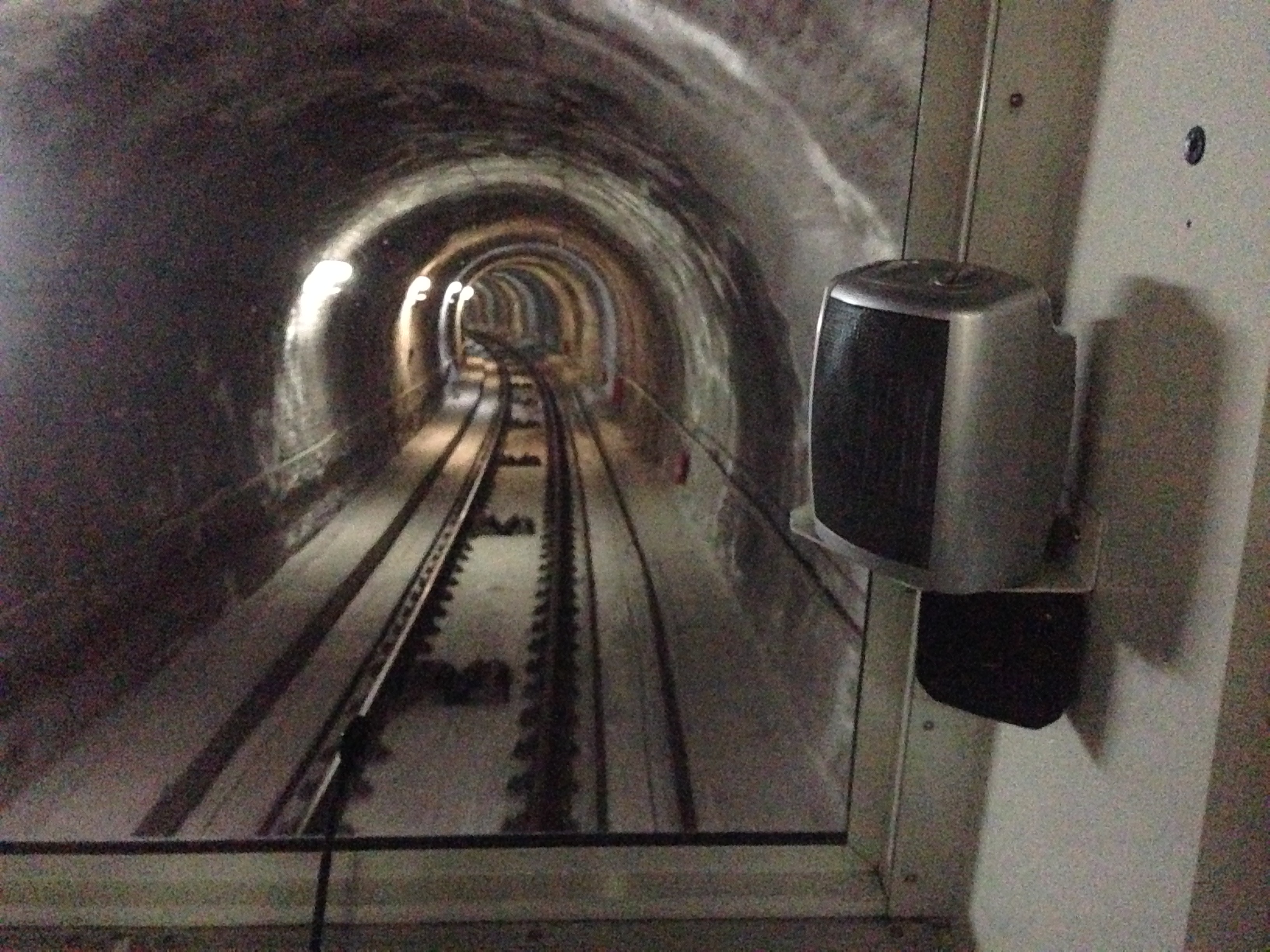 If you are unfamiliar with the funicular concept, picture a subway car riding up the side of a mountain with the car interiors designed to be level for the passengers while the electric propulsion gear and tracks follow the 30+ degree incline of the hill.