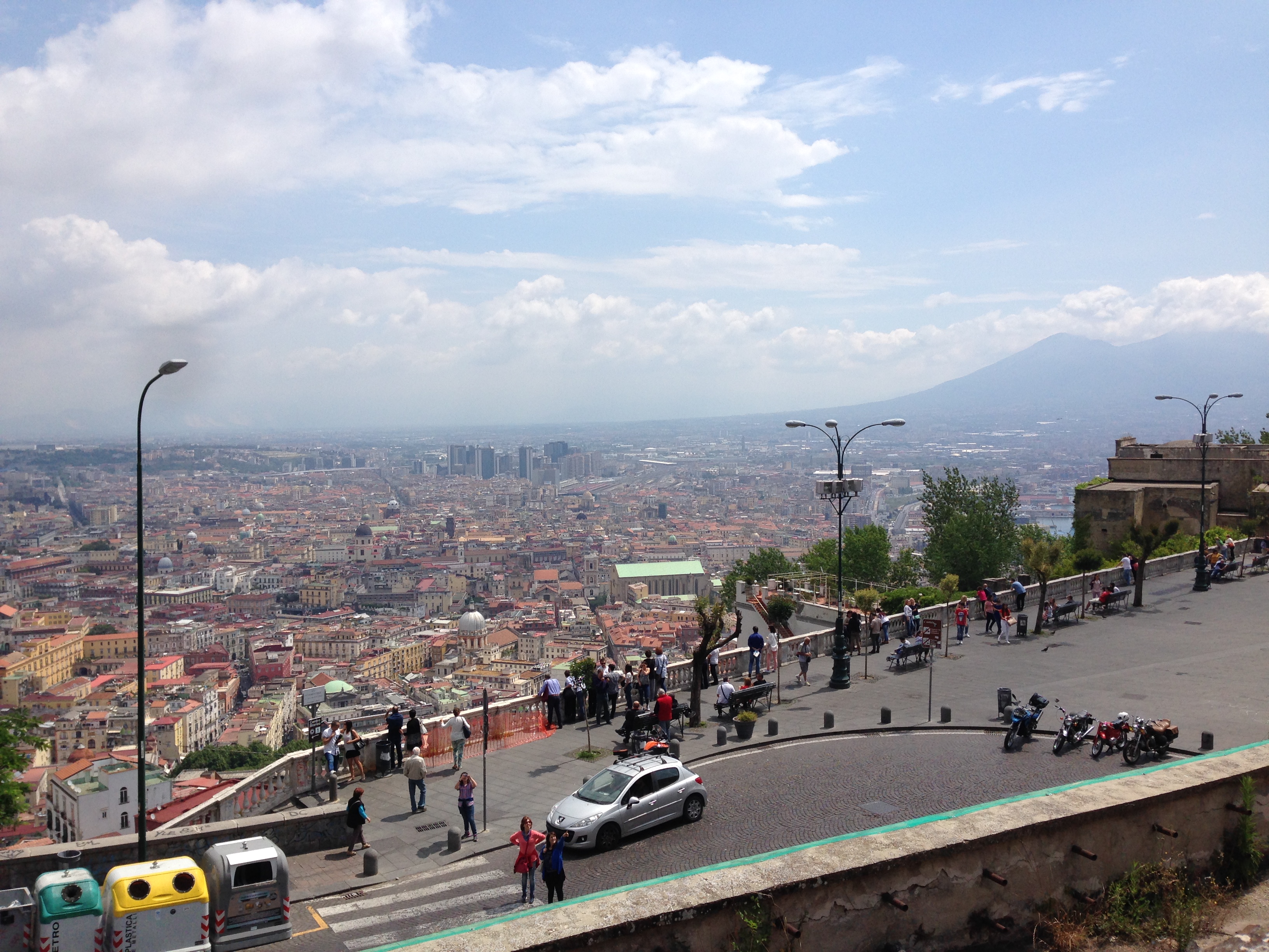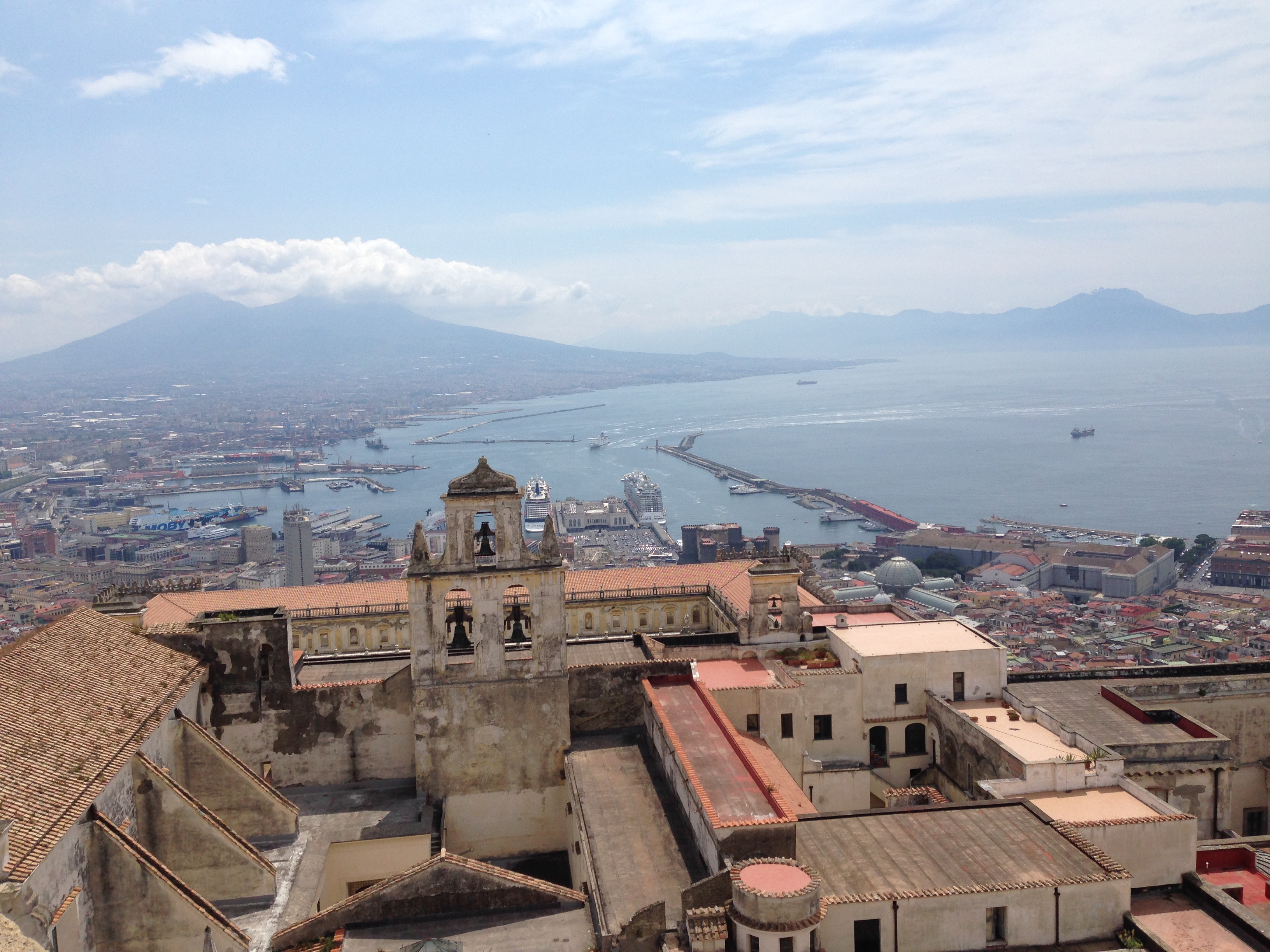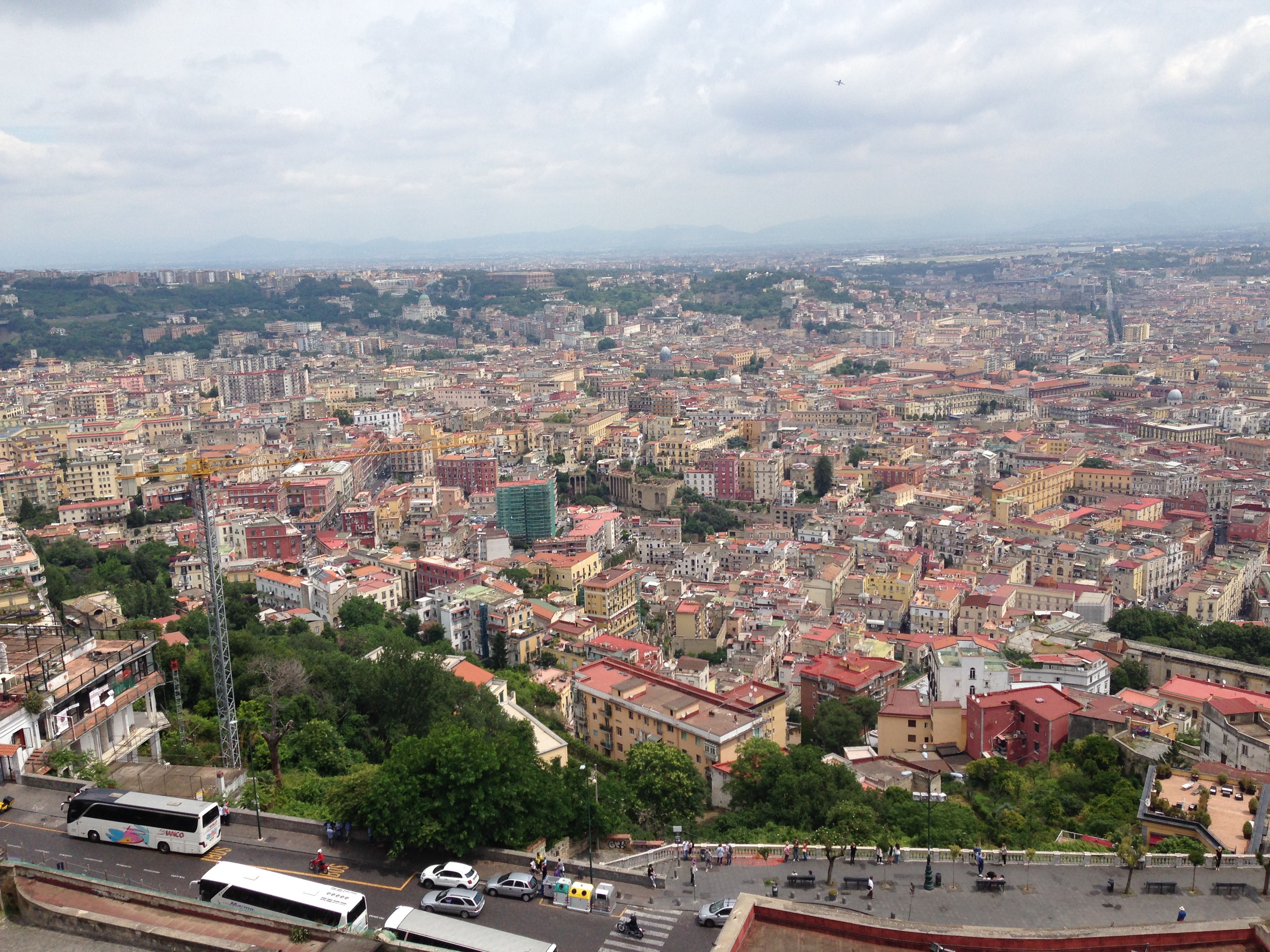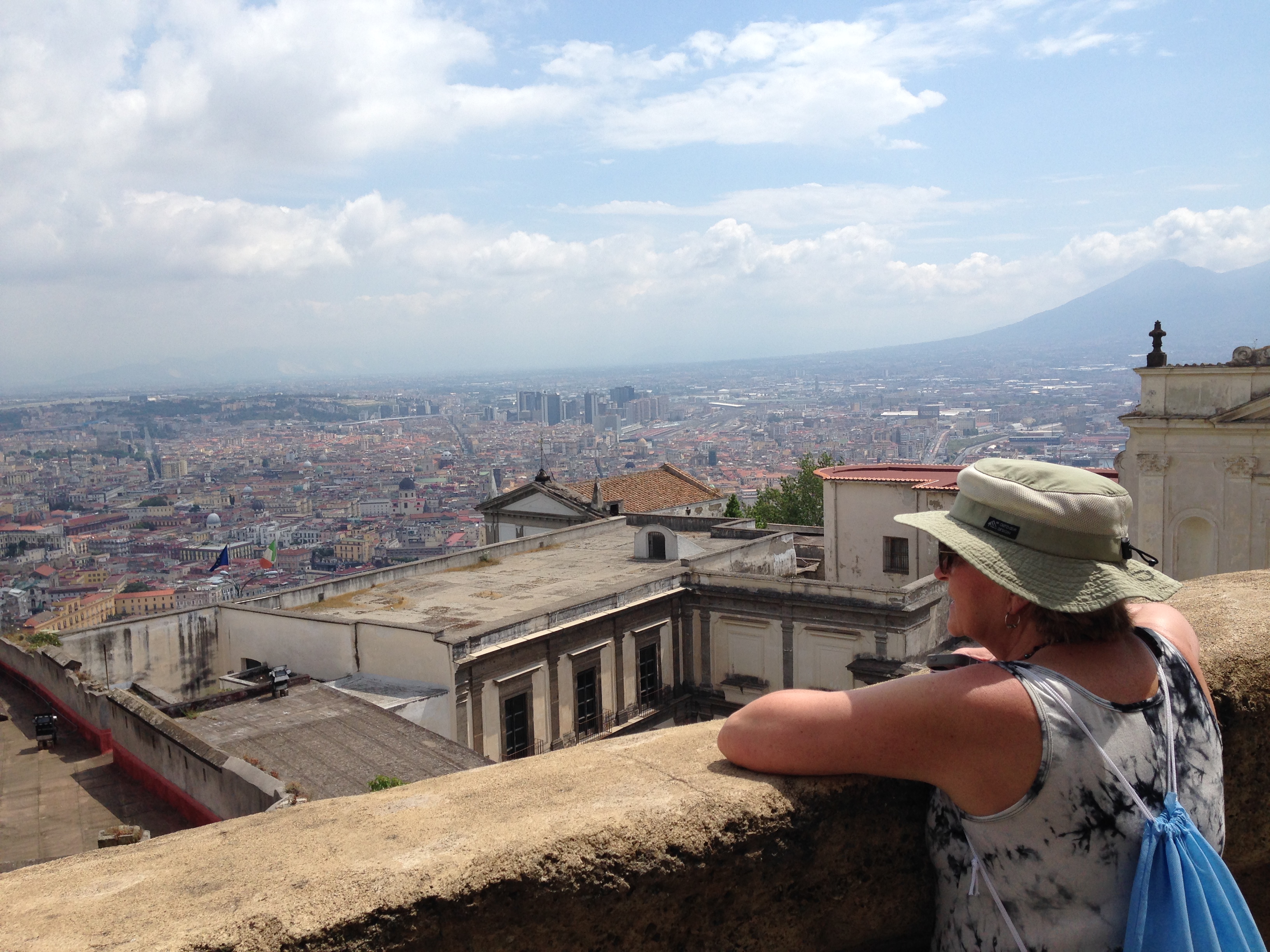 The city of Naples flows down a steep hillside to the miles of docks on the Mediterranean Sea. We saw from the tourist map that there were three funiculars, a “charming” old town and the enormous fortress of Castel St. Elmo on the hilltop.