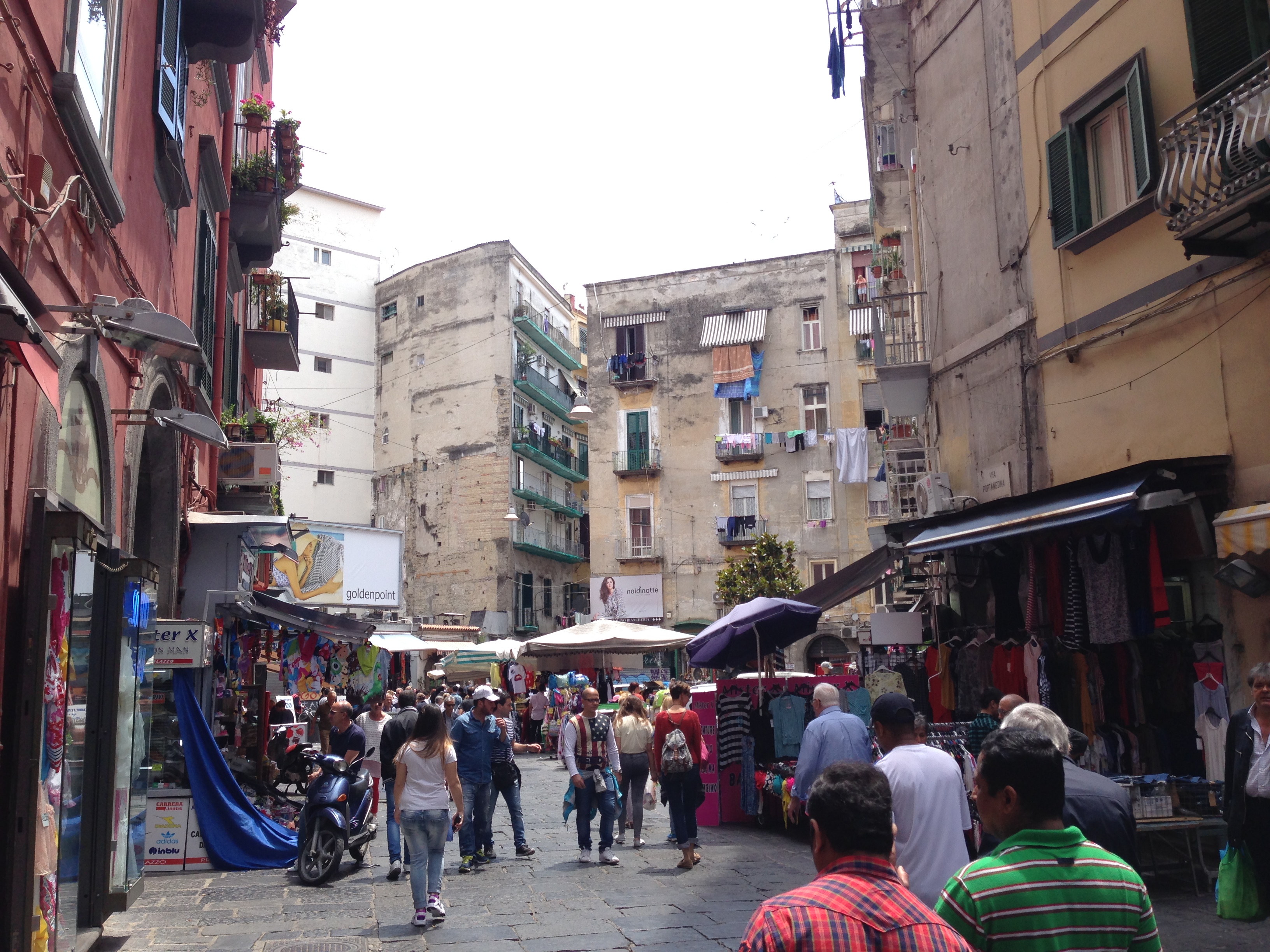 After a couple hundred yards, we evidently outpaced the maximum range of an Amstel bottle hurled from the ramparts and the footing became less sparkly. We trudged on until the stairs ended after about a quarter mile and we walked into the old town of Naples, full of small piazzas, narrow alleys and throngs of Sunday strollers eating gelato, laughing and enjoying the gorgeous weather.