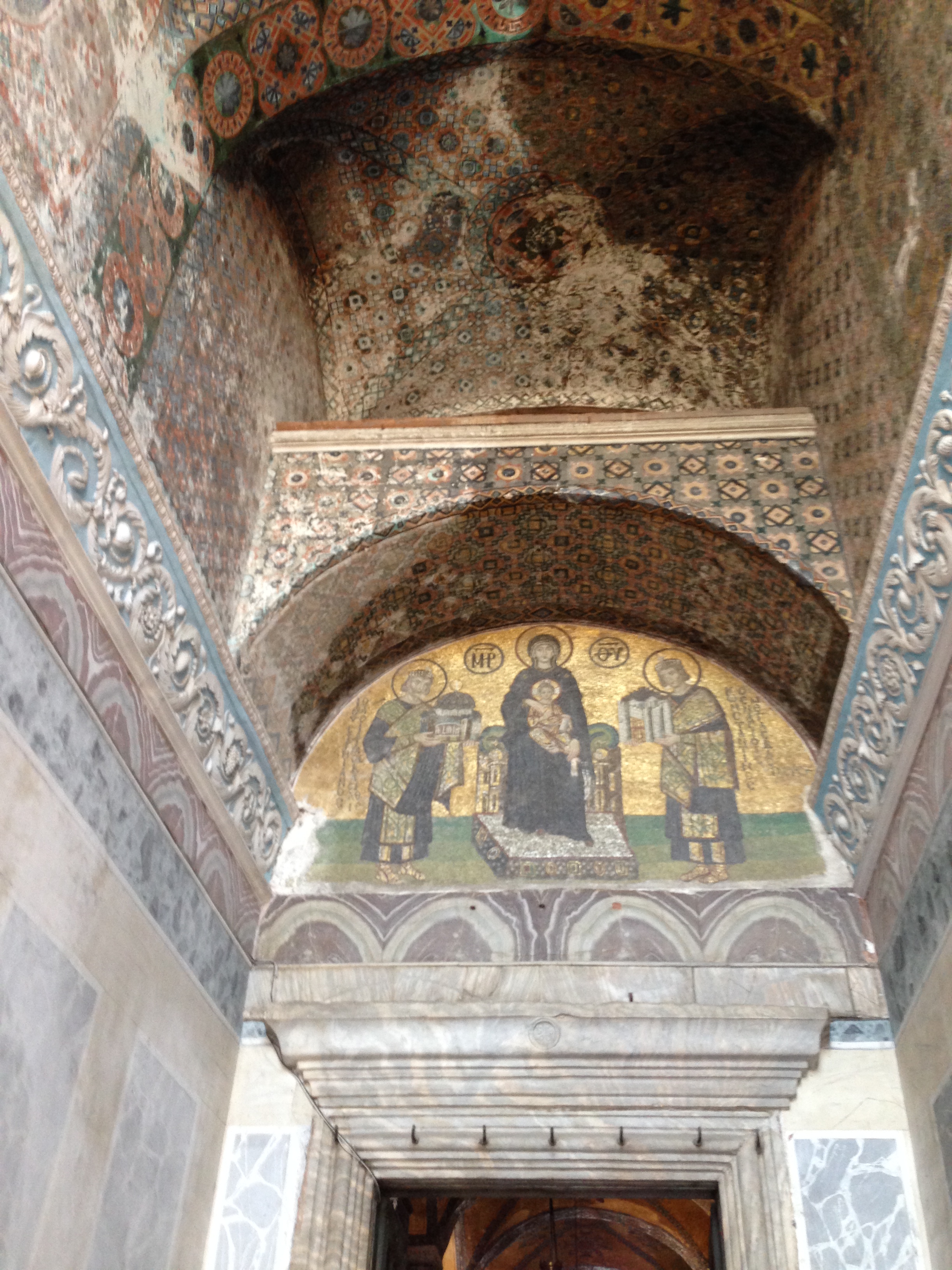 Over one of the exits we see Emperors Justinian and Constantine presenting the Virgin Mother with models of Constantinople and the Hagia Sophia. This had been painted over.