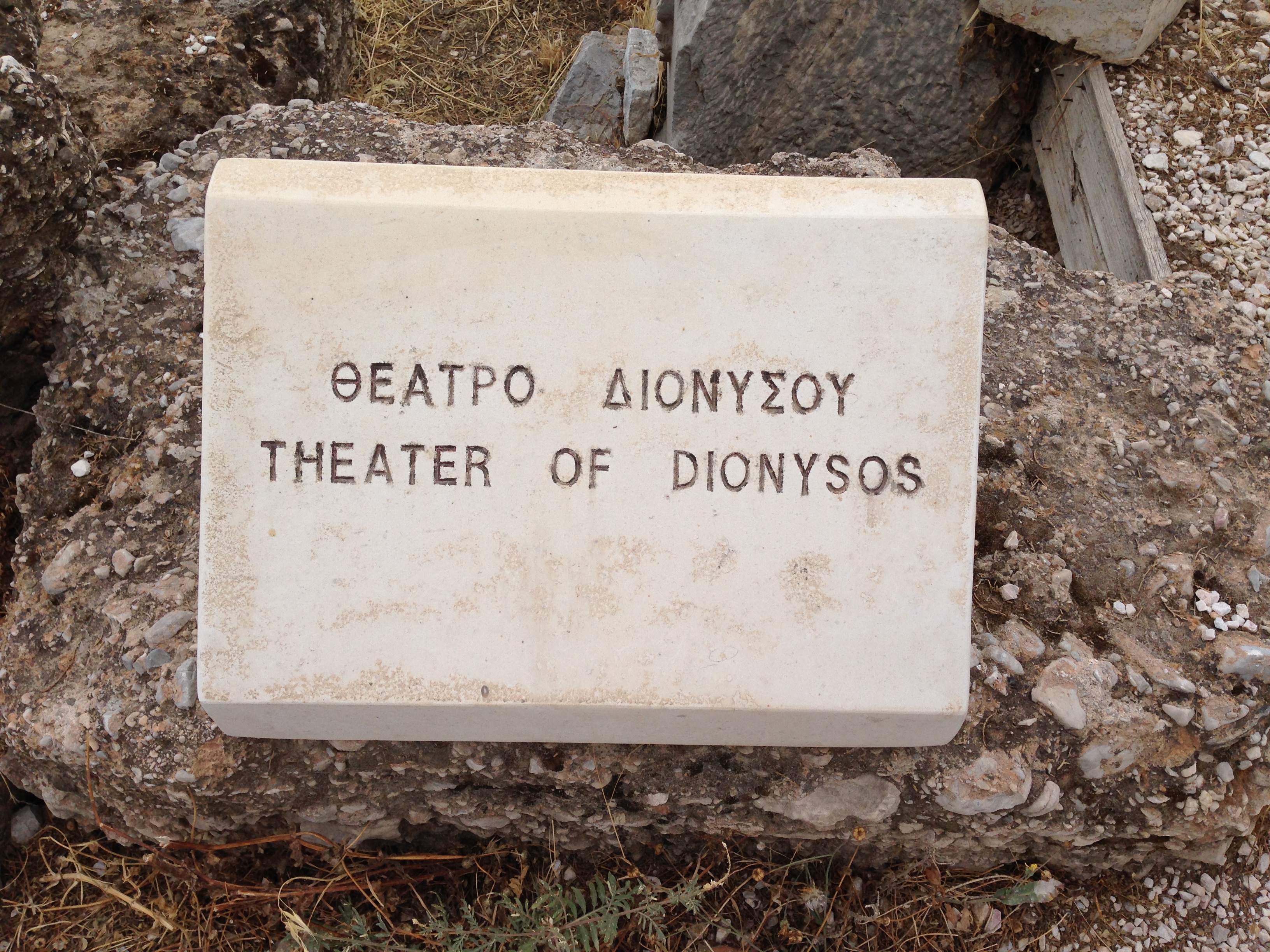 Wikipedia: The Theatre of Dionysus Eleuthereus is a major theatre in Athens, built at the foot of the Athenian Acropolis. Dedicated to Dionysus, the god of plays and wine (among other things), the theatre could seat as many as 17,000 people with excellent acoustics,[1] making it an ideal location for ancient Athens’ biggest theatrical celebration, the Dionysia. It was the first stone theatre ever built, cut into the southern cliff face of the Acropolis, and supposedly birthplace of Greek tragedy. The remains of a restored and redesigned Roman version can still be seen at the site today. The site was used as a theatre since the sixth century BC. The existing structure dates back to the fourth century BC but had many other later remodelings.