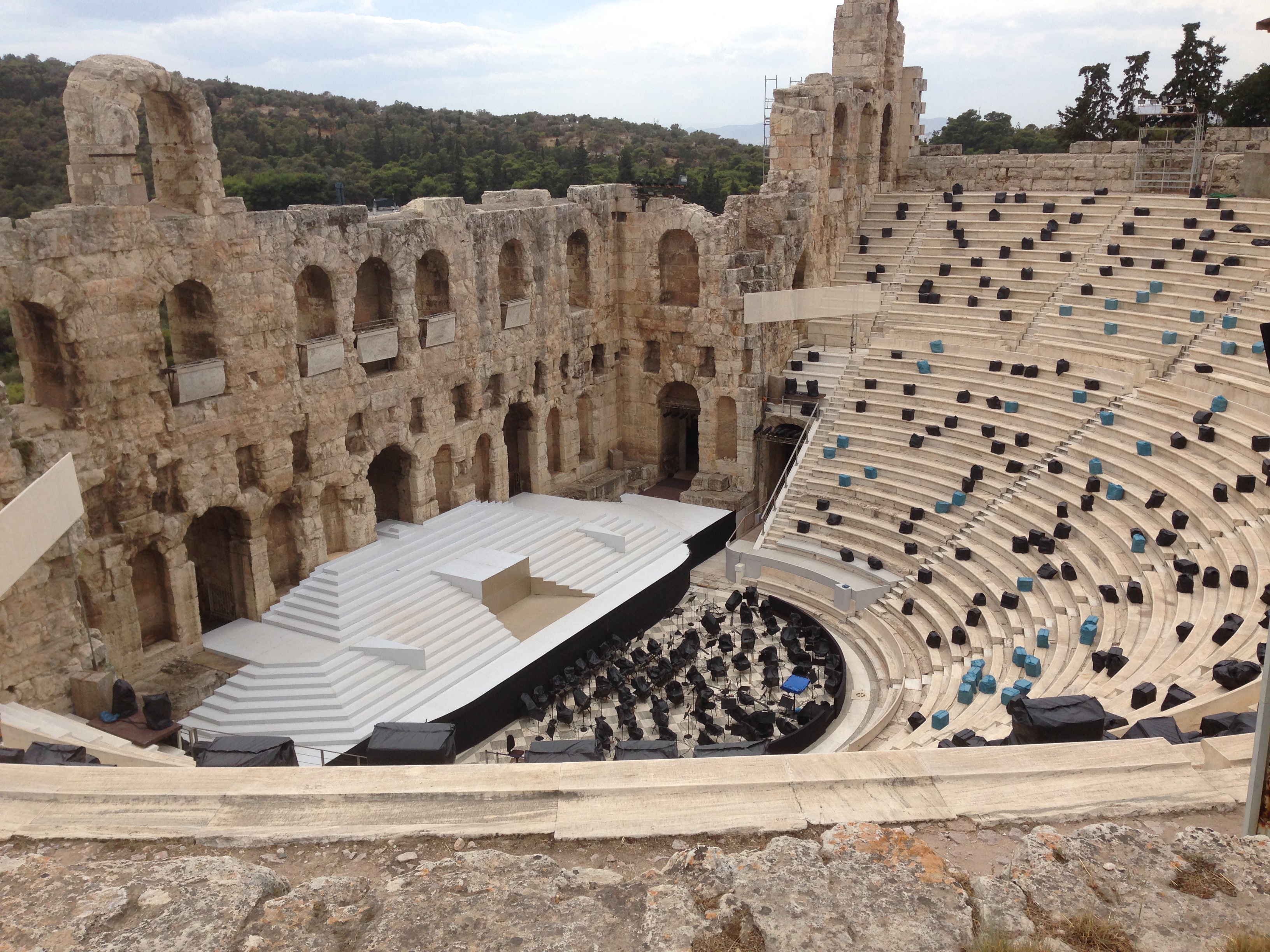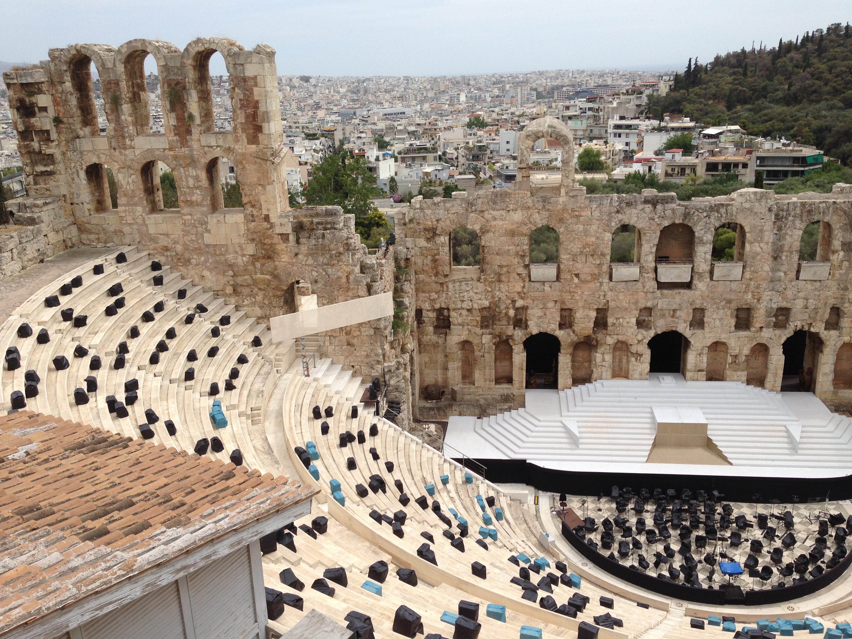 IMG_3320 After being partially restored by the government in the 1950s, the theater is used today for concerts and events as part of the annual “Athens Festival”. The black and blue bags on the steps contain seat cushions, protected from the weather.